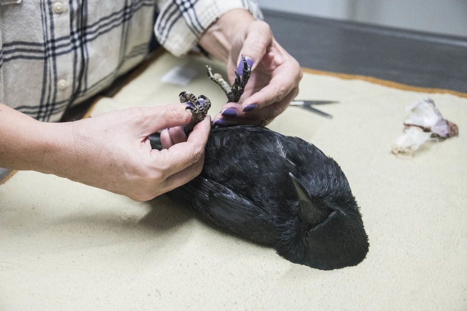 Aux petits soins Sur place, mercredi après-midi, Nadia Rapisardi, une des dix bénévoles qui s’activent pour faire tourner le sanctuaire, ausculte la patte droite de la corneille arrivée à Erminea le 6 octobre dernier. «Elle ne pouvait plus du tout marcher, explique l’assistante en pharmacie de profession. Alors je lui ai confectionné une attelle à l’aide d’un Q-tips, de bandes de gaze et d’un sparadrap pour coller le tout.»